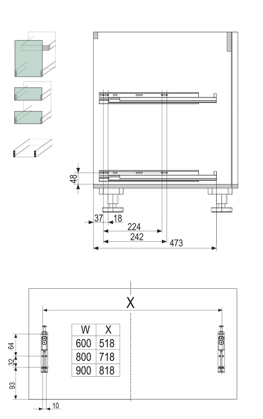 - 1 большой модуль для посуды + 1 малый модуль для посуды + 1 малый модуль с решеткой