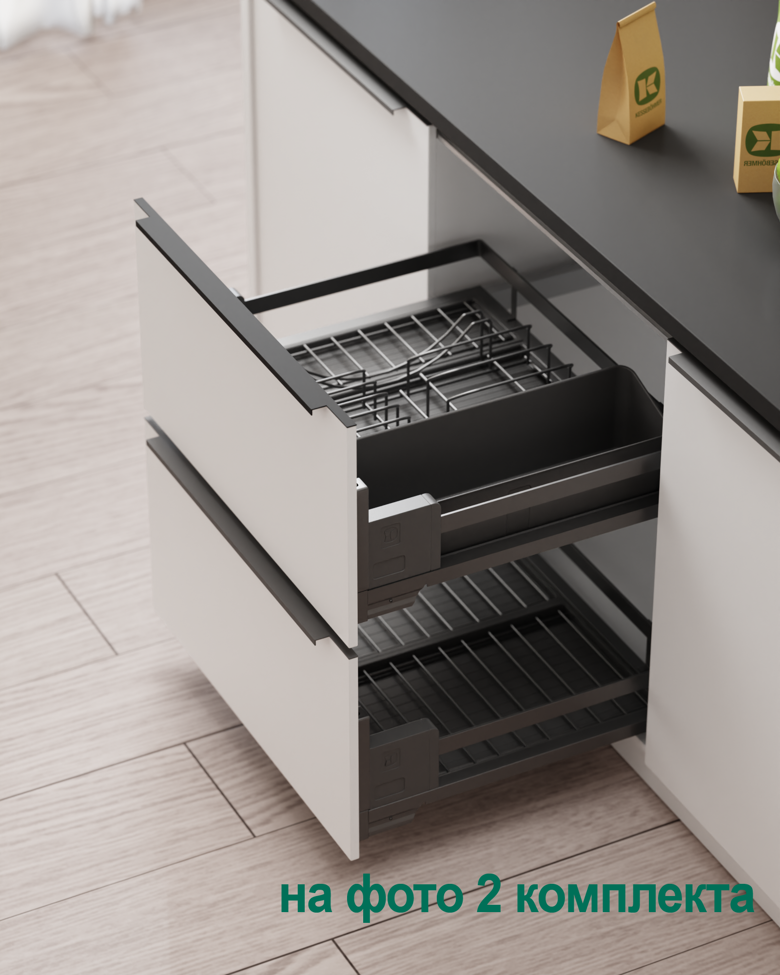 Ответ: Используйте модульную систему diningAGENT от Kesseböhmer — с полным выдвижением, возможностью мытья поддонов в посудомойке, защитой от царапин и функцией сервировочного подноса. Подходит для тарелок, блюд, чашек и столовых приборов. Доступна в цветах титан и антрацит, с доводчиком и нагрузкой до 12 кг.